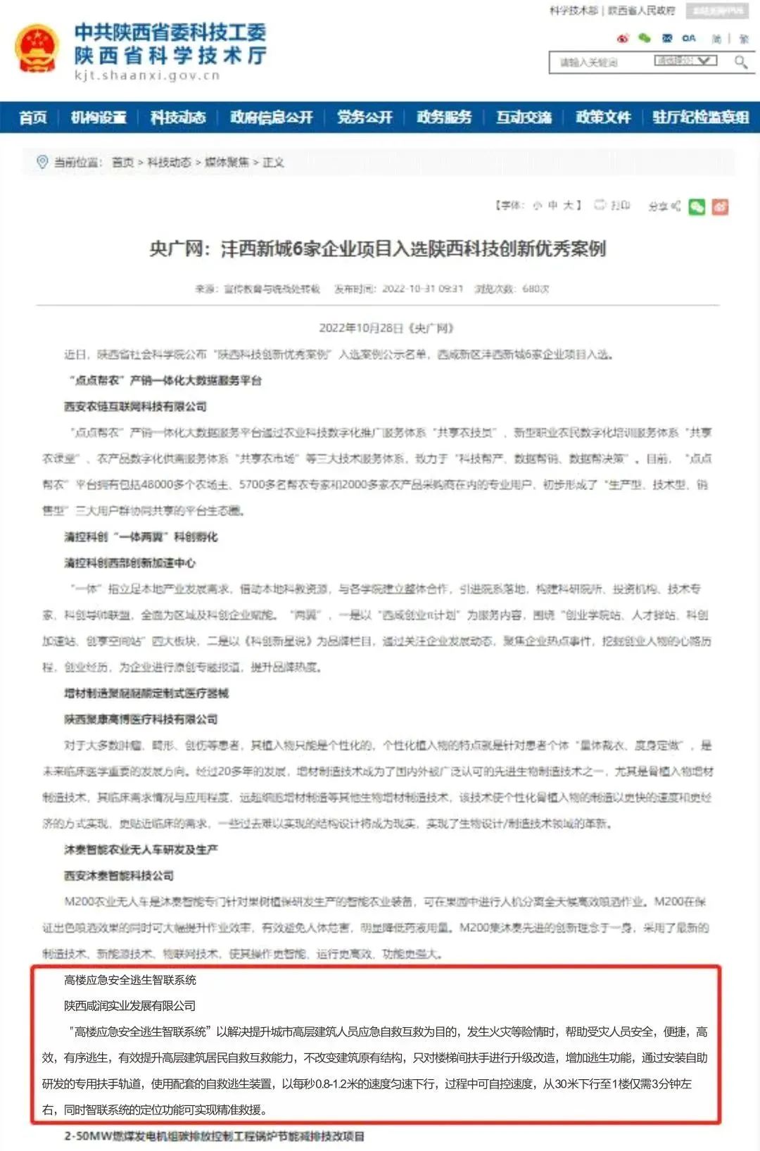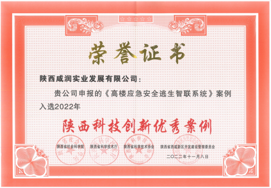 我司自主研發(fā)的專利型科技項目“高樓應(yīng)急安全逃生智聯(lián)系統(tǒng)”作為“創(chuàng)新賦能高效治理高品質(zhì)生活”板塊成功入選2022年陜西科技創(chuàng)新優(yōu)秀案例。據(jù)了解,灃西新城共有6家企業(yè)項目入選。