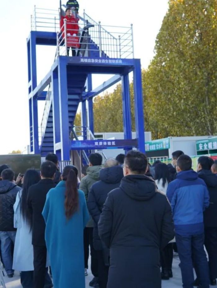 本次觀摩會由現場觀摩和會議座談兩部分組成,觀摩會設置在市級重點項目水城之心應急安全科創谷,現場 1:1 還原了“高樓應急安全逃生智聯系統”的鋼結構展示架,便于與會嘉賓沉浸式體驗和觀摩,同時,該系統也是水城之心應急安全科創谷項目開發建設的四大亮點之一,可有效解決城市高層建筑遇災人員自救逃生難題,補齊城市高層建筑應急疏散基礎設施建設短板,技術先進、性能可靠、操作簡便,極大程度增加逃生幾率。通過現場觀摩和研討,與會嘉賓紛紛對該系統的高效、有序、快速下滑給予高度贊許,并表示項目的未來發展潛力及社會價值遠遠超出了他們的預期。